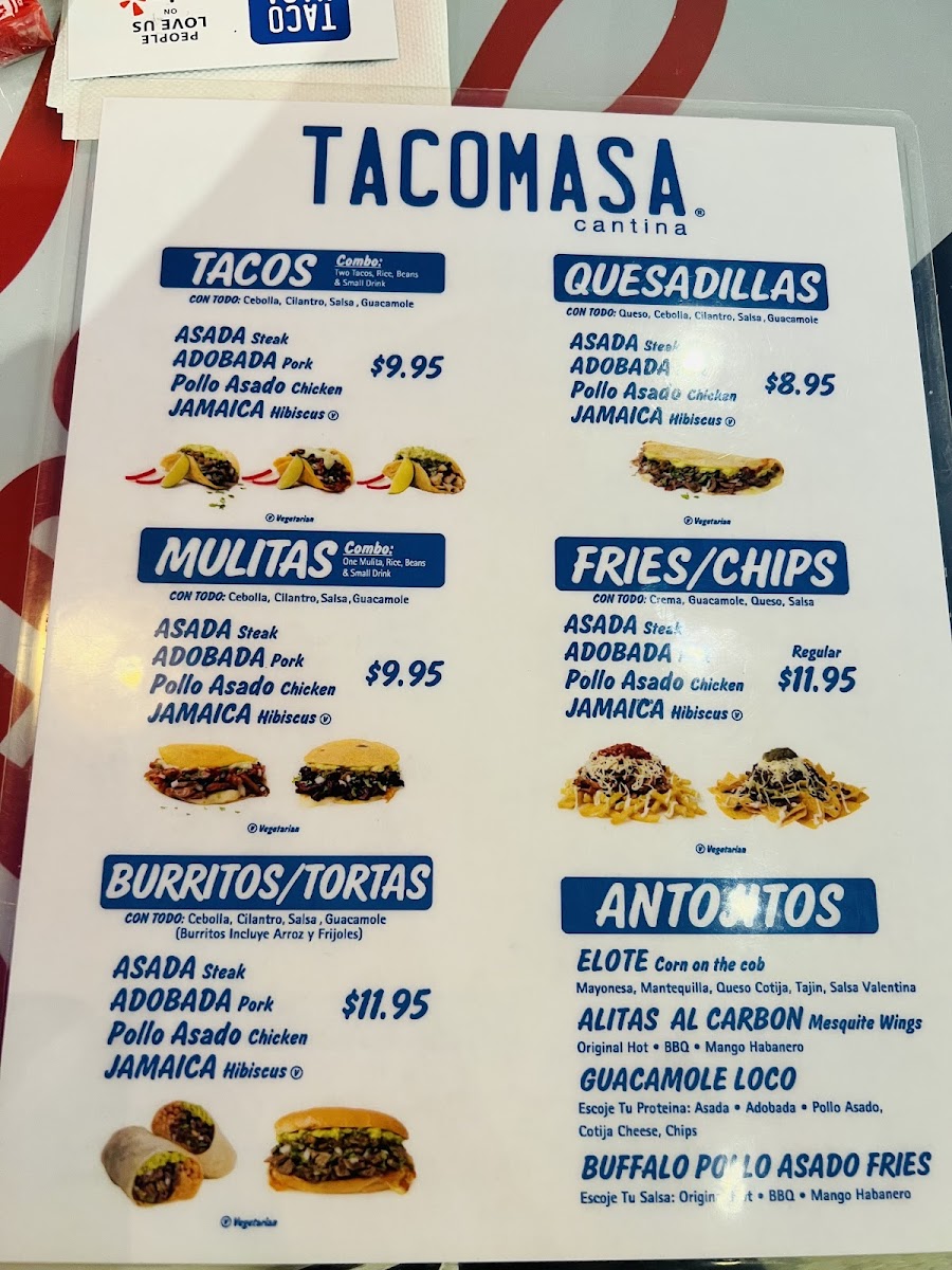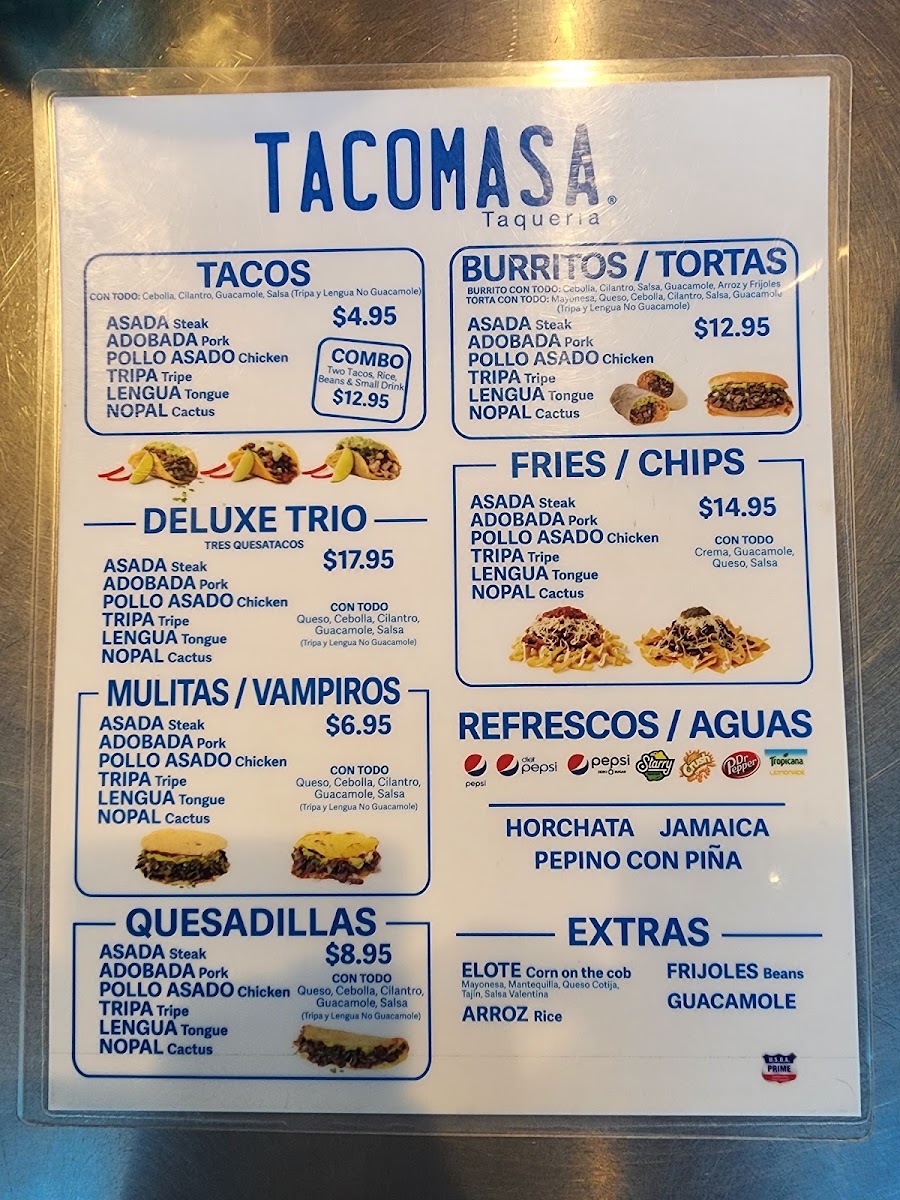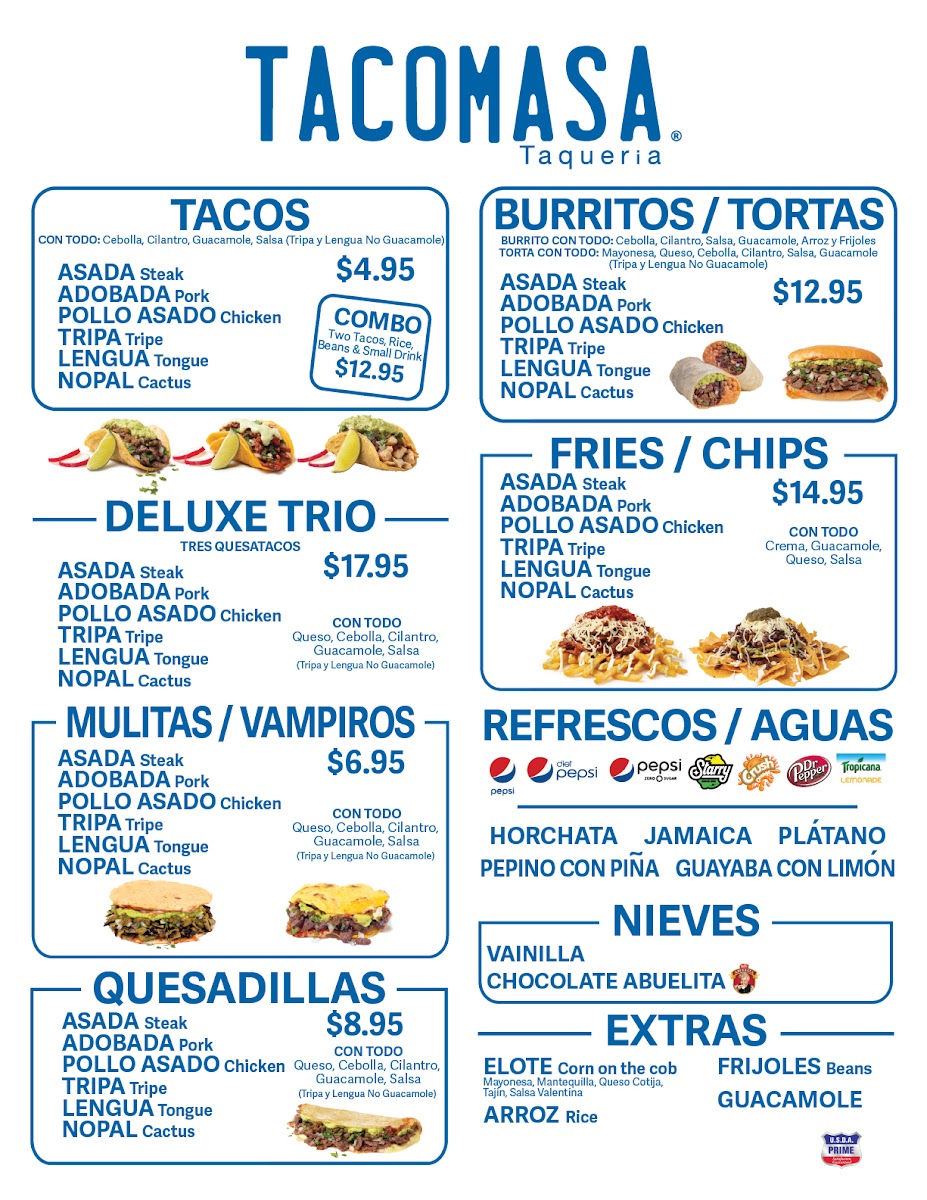 Complementing the main dishes are well-chosen sides and extras like Chiles Jalapenos, Creamy Guacamole 8 Oz, Salsa 8 Oz, Chiles Gueros, and Side Of Beans 4 Oz, along with traditional Elote under Antojitos. Drinks such as Topo Chico, Pepsi, Dr. Pepper, Pepsi Zero, and Jamaica round out the experience, while snacks like Bimbo Bimbunuelos, Bimbo Pinguinos, Bimbo Rebanadas, Bimbo Mantecadas, and Bimbo Gansitos add a nostalgic touch. Overall, Tacomasa Cypress delivers a well-rounded menu that successfully blends variety, tradition, and satisfaction, making it a reliable choice for both casual meals and catered events.